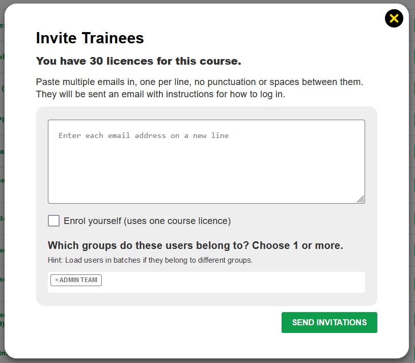 - Invite by uploading a spreadsheet, or adding them one at a time (trainees don't need emails [although it's advised], and you can enter their names at the same time).