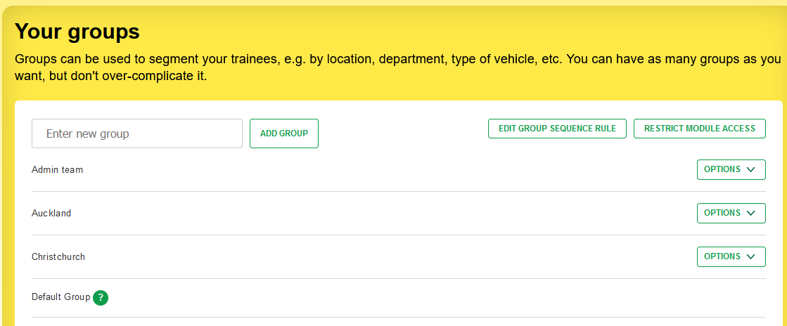 If you have any more than a few trainees you might want to sort them into groups. For example, you could group by location (e.g. Auckland, Hamilton, Tauranga), type of trainees (e.g. truck, car, forklift), job role (e.g. sales, service), or employment status (e.g. interview candidate, employee), or a mixture of multiple types like in the image below. It's up to you. There's a default group in there already. You can't delete this, but you can unassign any trainees from it. For a guide on setting up groups, click here.